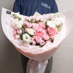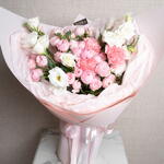 carnation pink - 3 ud. lisianthus white - 3 ud. ribbon satin - 1 ud. rosa mansfield park - 7 ud. pistachio leaves - 5 ud.