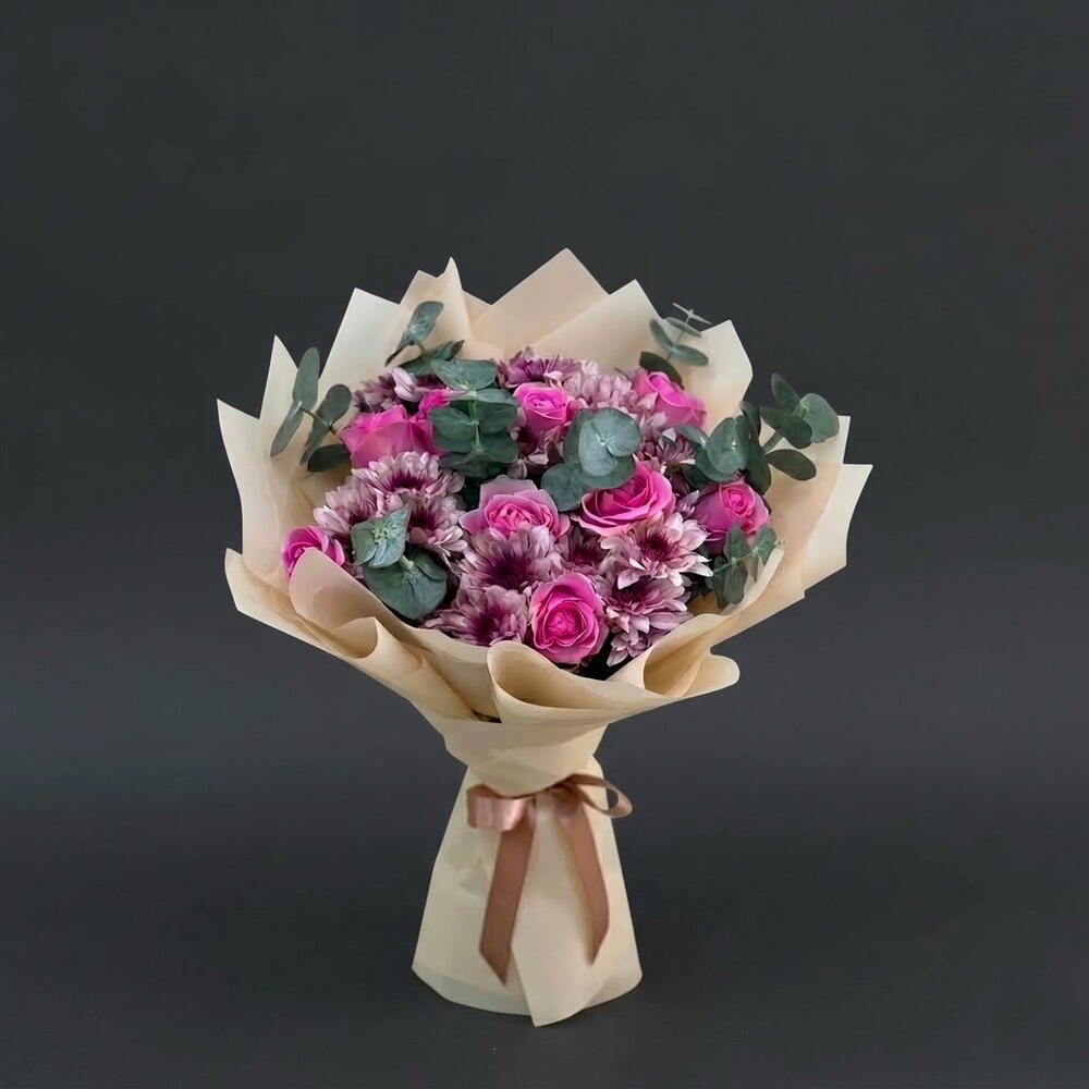 Eucalyptus - 3 ud. pink roses - 9 ud. crisantemos púrpura de doble color - 5 ud.