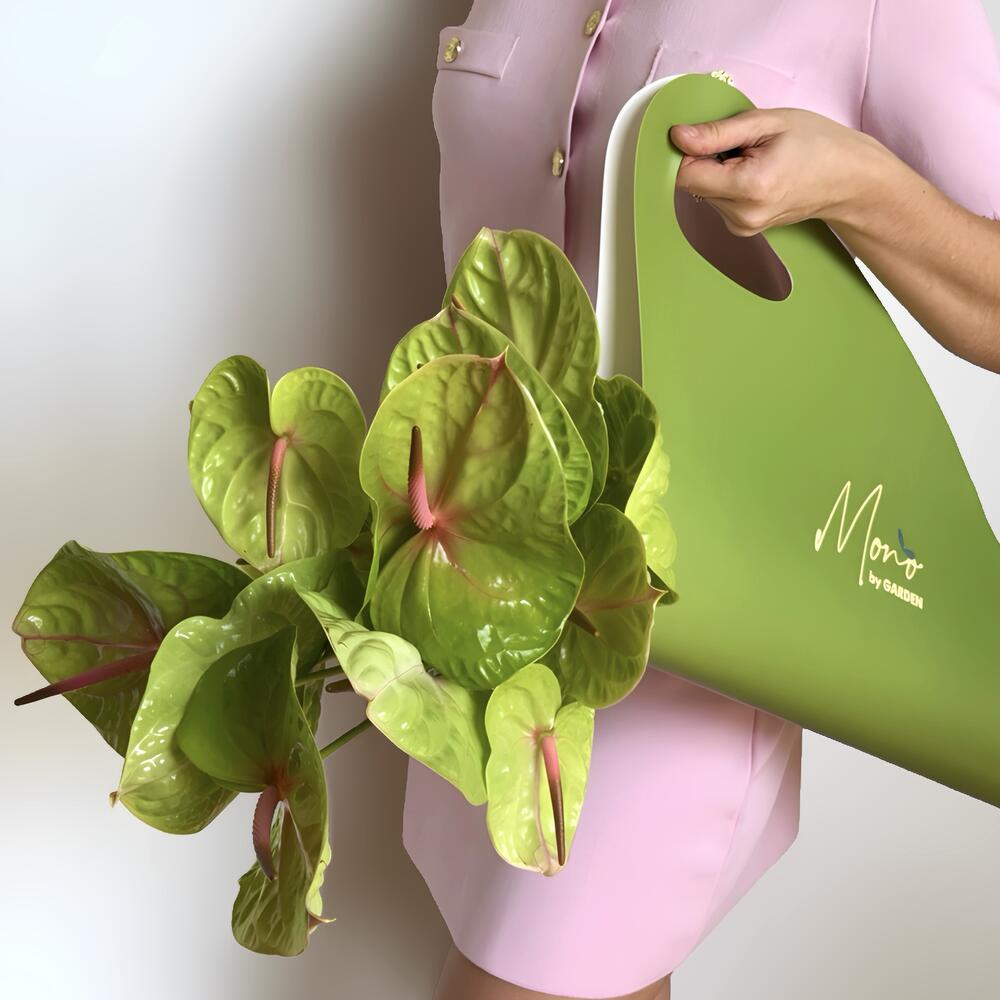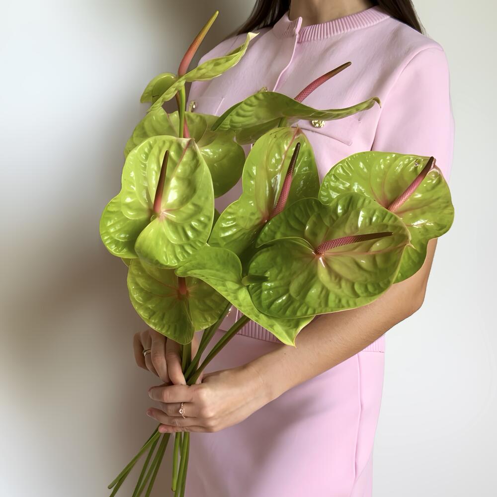 Ramo elegante de anturios verdes y frescos — exóticos, duraderos y perfectos para añadir un toque moderno a cualquier espacio.