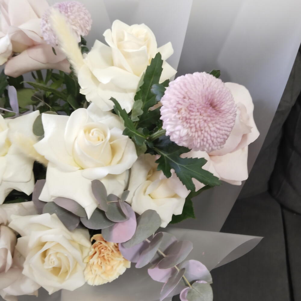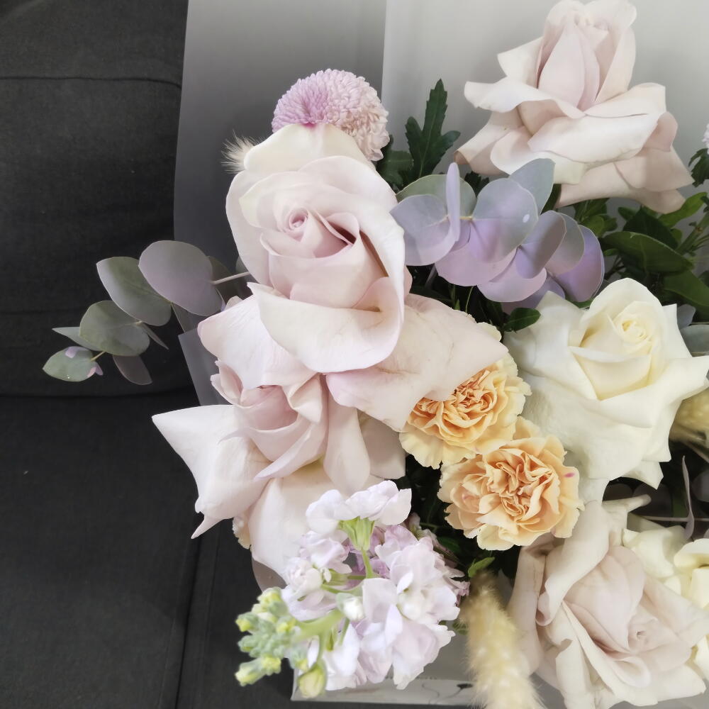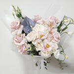 Lisianthus - 4 ud. light pink rose - 6 ud. tulipán rosa - 5 ud. anturio azul - 1 ud. media rosa blanca - 5 ud.
