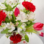 Armonía Radiante: Una Sinfonía de Rojo y Blanco Este elegante arreglo muestra la belleza de la naturaleza en un impresionante jarrón de cerámica. Diez vibrantes tulipanes rojos, 10 inmaculadas alstroemerias blancas, y siete claveles rojos clásicos crean una exhibición cautivadora de color y textura. Los tonos intensos y las delicadas flores se complementan perfectamente con el lujoso jarrón de cerámica, convirtiéndolo en una pieza verdaderamente especial. Eleva Cualquier Espacio con la Belleza Floral Atemporal