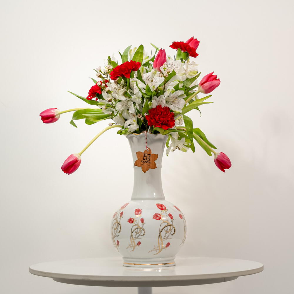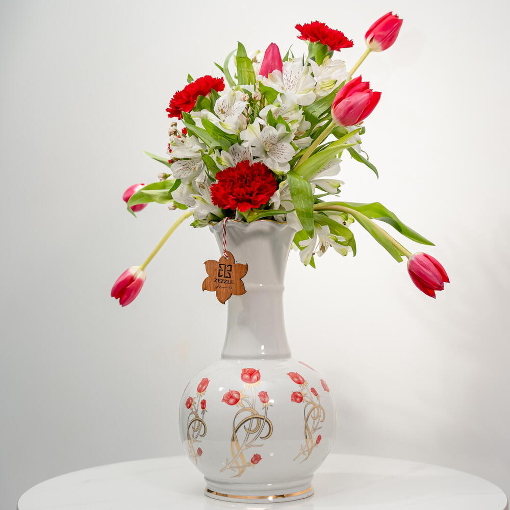 alstroemeria blanca - 10 ud. clavel rojo - 7 ud. tulipán rojo - 10 ud. jarrón cerámico de lujo - 1 ud.