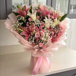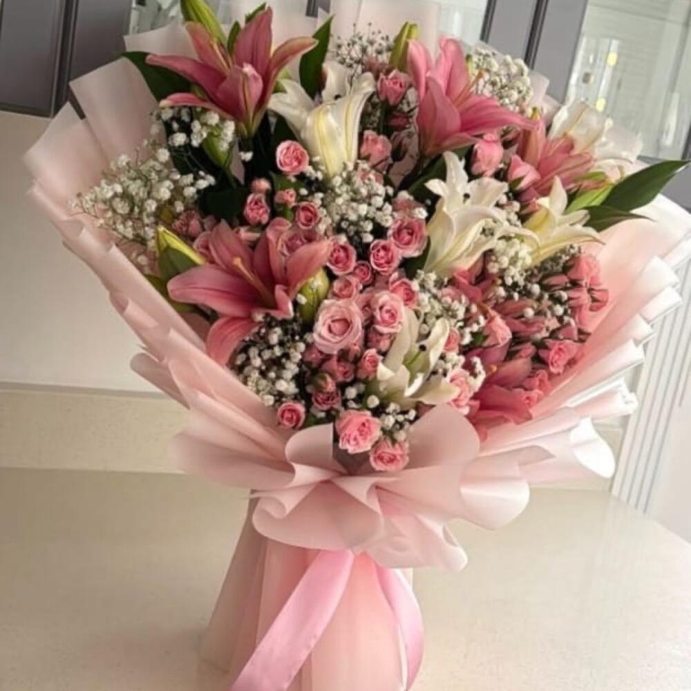 Gypsophila - 5 ud. lirio blanco - 3 ud. wrapping paper - 6 ud. lirio rosa - 4 ud. dinara rosa spray - 9 ud.