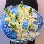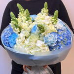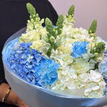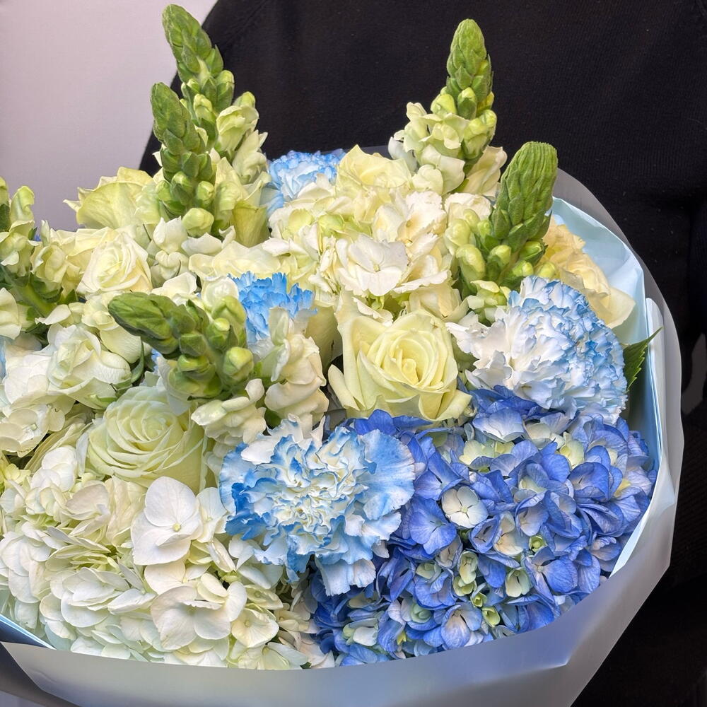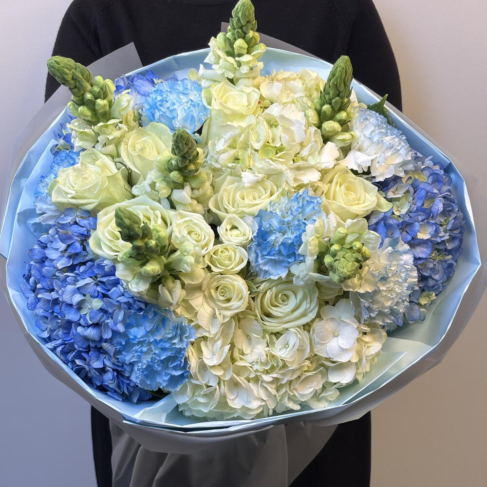 Eleva el momento con la Azure Dream Bloom, una obra maestra del arte floral. Este ramo extragrande y de primera calidad presenta una base con aspecto de nube de hortensias azul cielo y marfil, acentuada por elegantes rosas blancas y altísimas bocas de dragón que aportan un toque de textura fresca de jardín. Envuelto en su característico papel azul suave, es la pieza perfecta para aniversarios, cumpleaños o simplemente para decir que estoy pensando en ti.