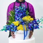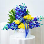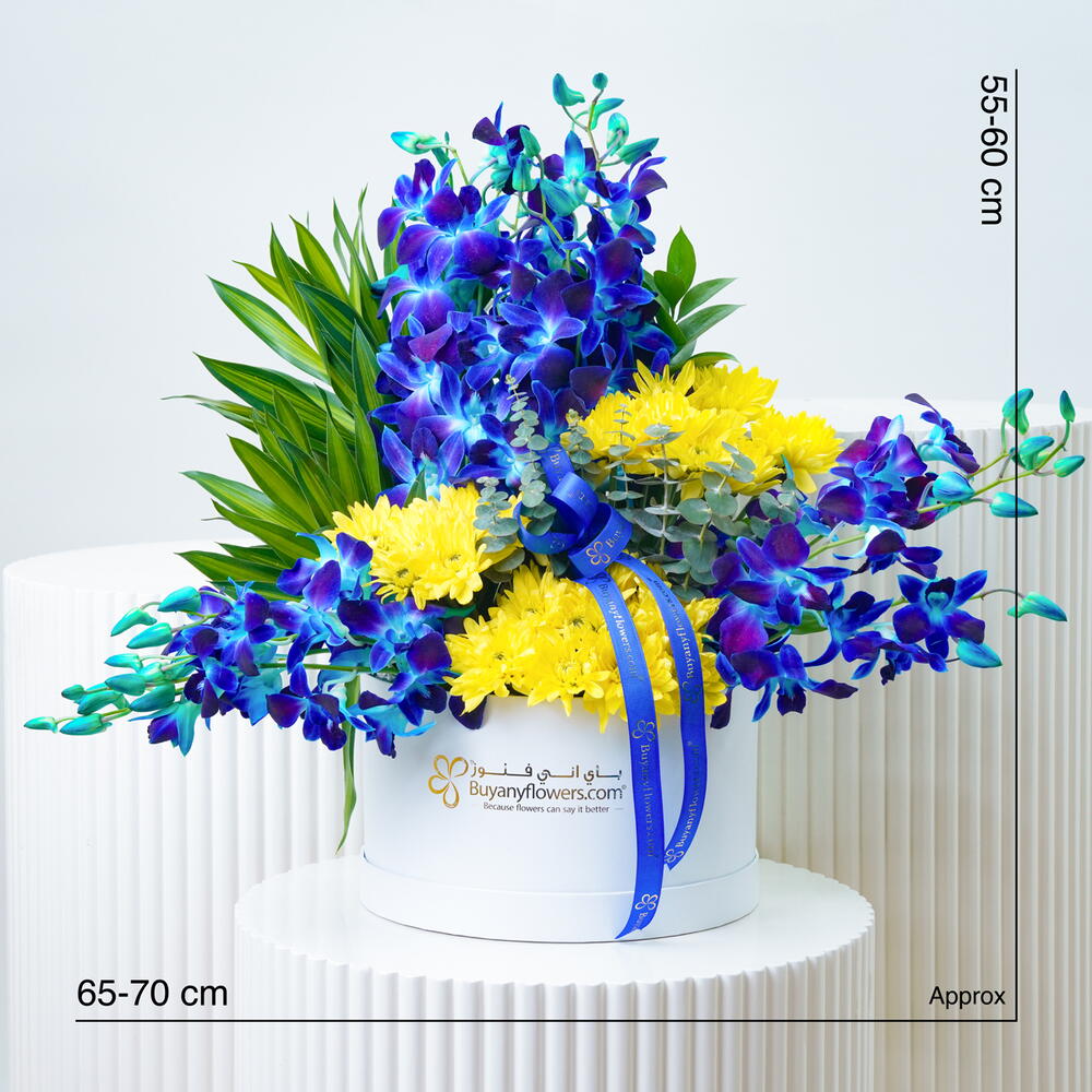 Este exquisito arreglo floral reúne 15 encantadoras orquídeas azules, 5 margaritas amarillas brillantes, 2 atractivas ramas de canónigos de Jamaica, 3 ramas de ruscus exuberante y un toque de eucalipto aromático. Cuidadosamente dispuestas en una pequeña caja blanca de 25 x 15 cm, símbolos de pureza que realzan la elegancia del conjunto. El cautivador ramo está atado con una delicada cinta azul, que realza aún más su encanto. Un regalo que sin duda cautivará a sus seres queridos.