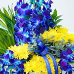 orquídeas azules - 15 ud. tallo de eucalipto - 1 ud. tallos de ruscus - 3 ud. tallos de margaritas amarillas - 5 ud. tallos de la canción de Jamaica - 2 ud. dispuesto en una pequeña caja blanca (25 × 15 cm) - 1 ud. atado con cinta azul - 1 ud.