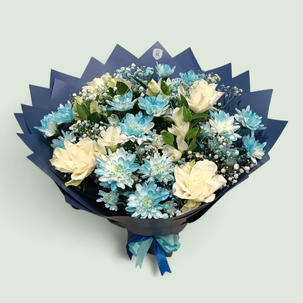Un ramo refrescante con una armoniosa mezcla de crisantemos azul claro, alstroemerias blancas y delicada gypsophila blanca, que crea una hermosa composición de tonos fríos. Está elegantemente envuelto en papel azul marino texturizado y atado con una cinta azul a juego.