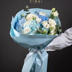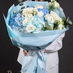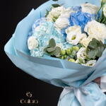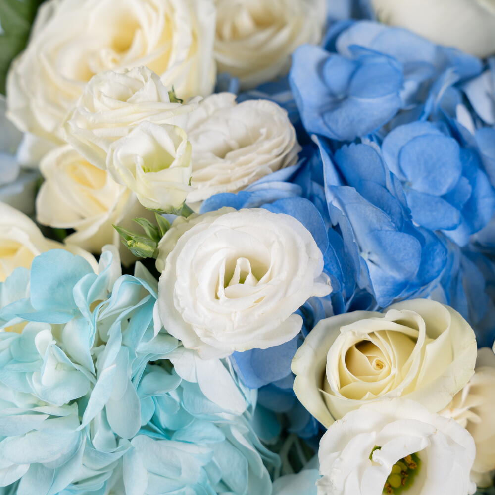Eustoma white - 5 ud. hydrangea blue - 3 ud. hortensia azul claro - 1 ud. rosas blancas - 5 ud.
