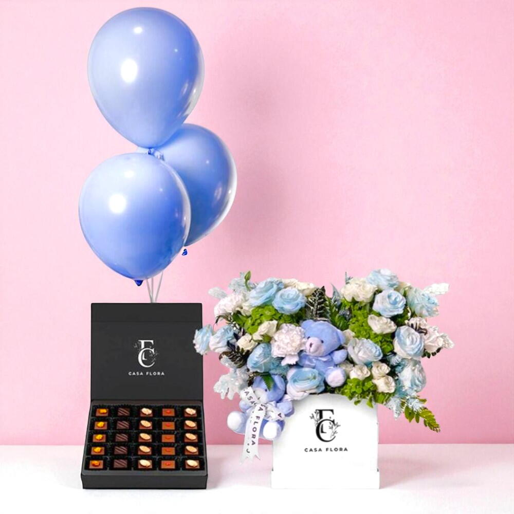 globos azules - 3 ud. rosas rosa pastel - 10 ud. una dulce combinación de un tierno osito de peluche - 2 ud. pequeña caja de chocolates - 400 gr
