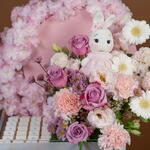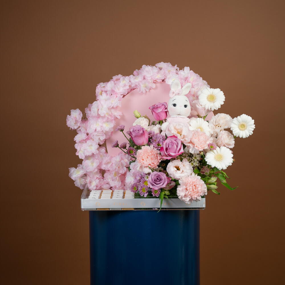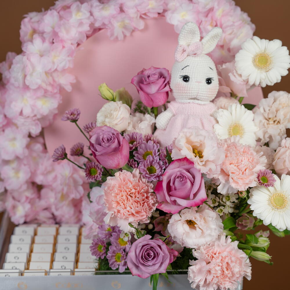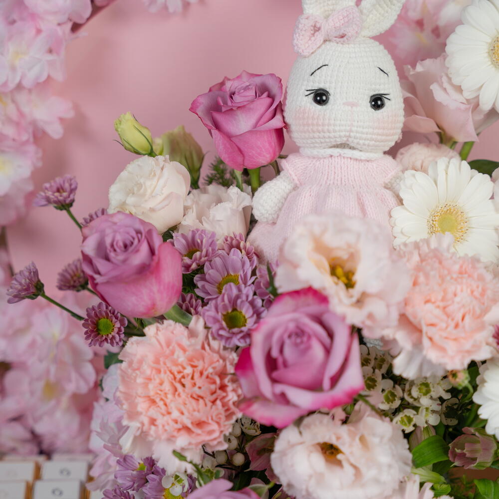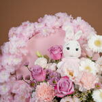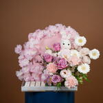 rosa púrpura intenso - 4 ud. Teddy bear - 1 ud. carnation pink - 4 ud. germini blanco - 4 ud. crisantemo santini rosa - 2 ud. blanco ceroso - 2 ud. alstroemeria rosa - 4 ud. eustoma rosa claro - 2 ud. callaia mezcla de chocolate - 24 ud. flores de cerezo artificiales rosas - 2 ud.