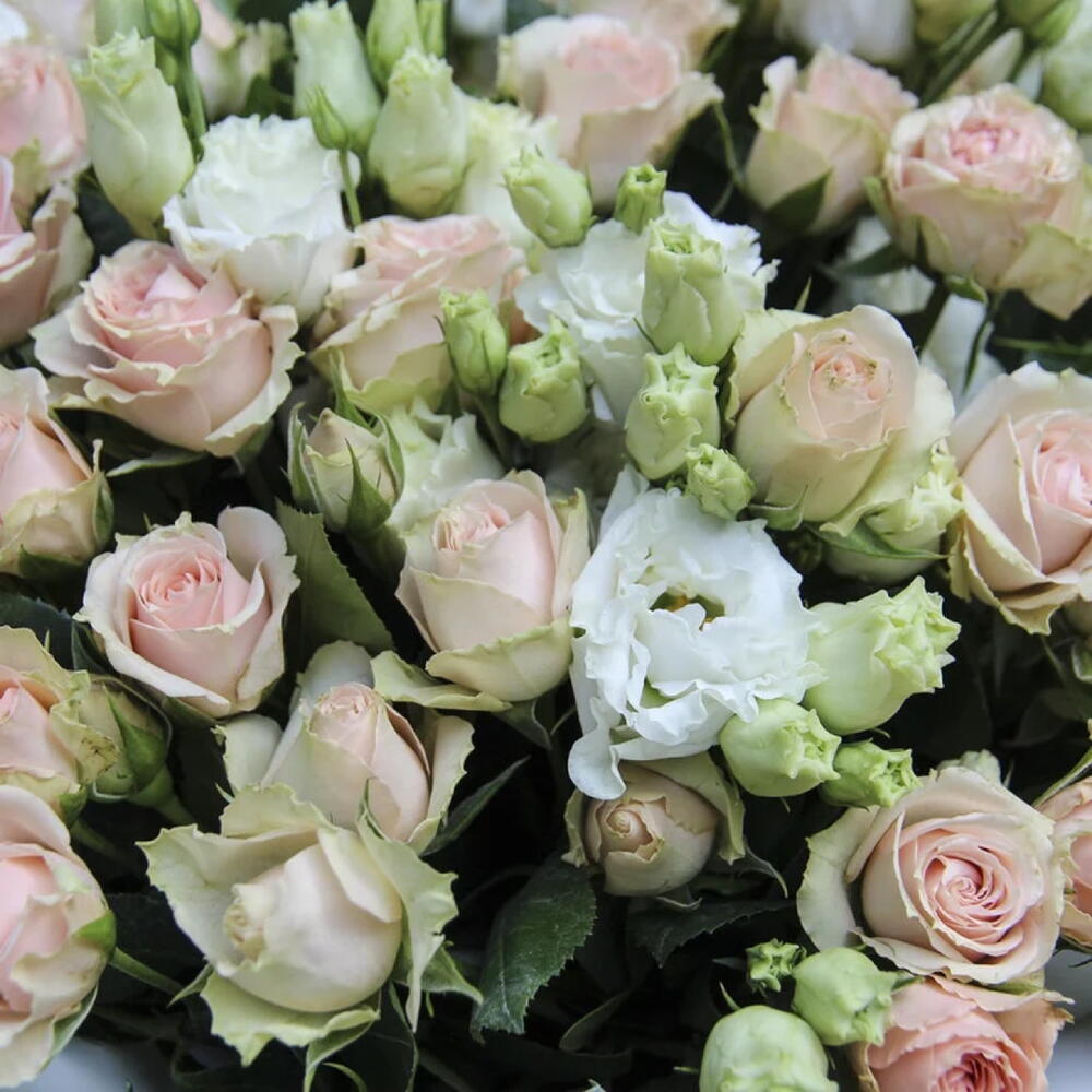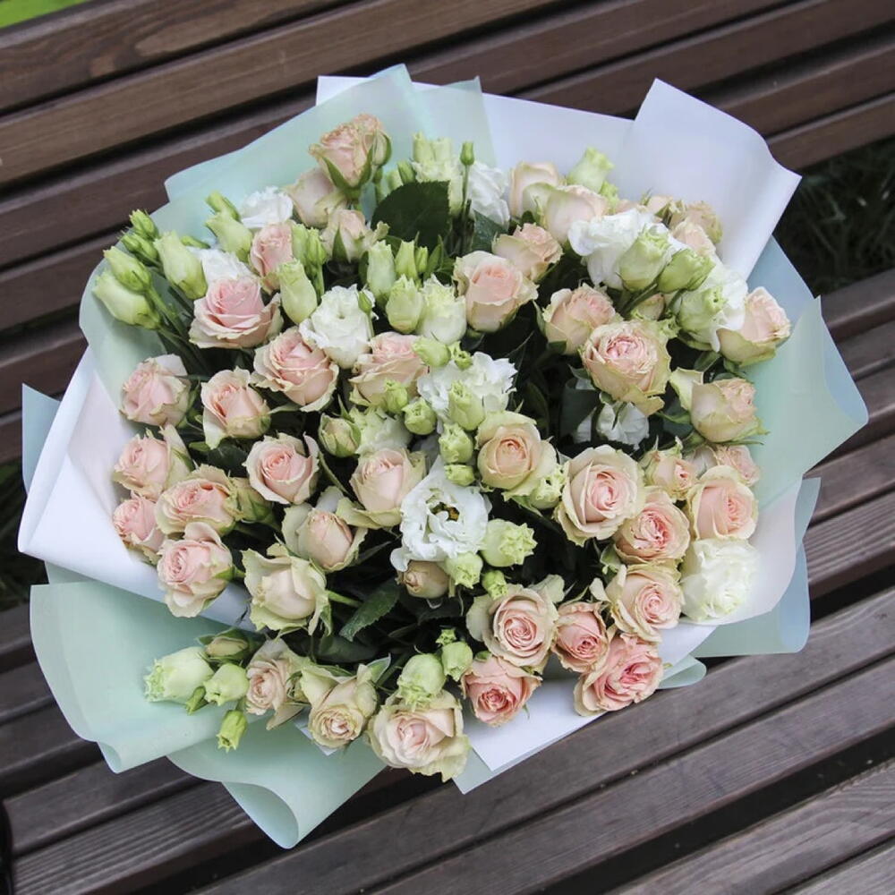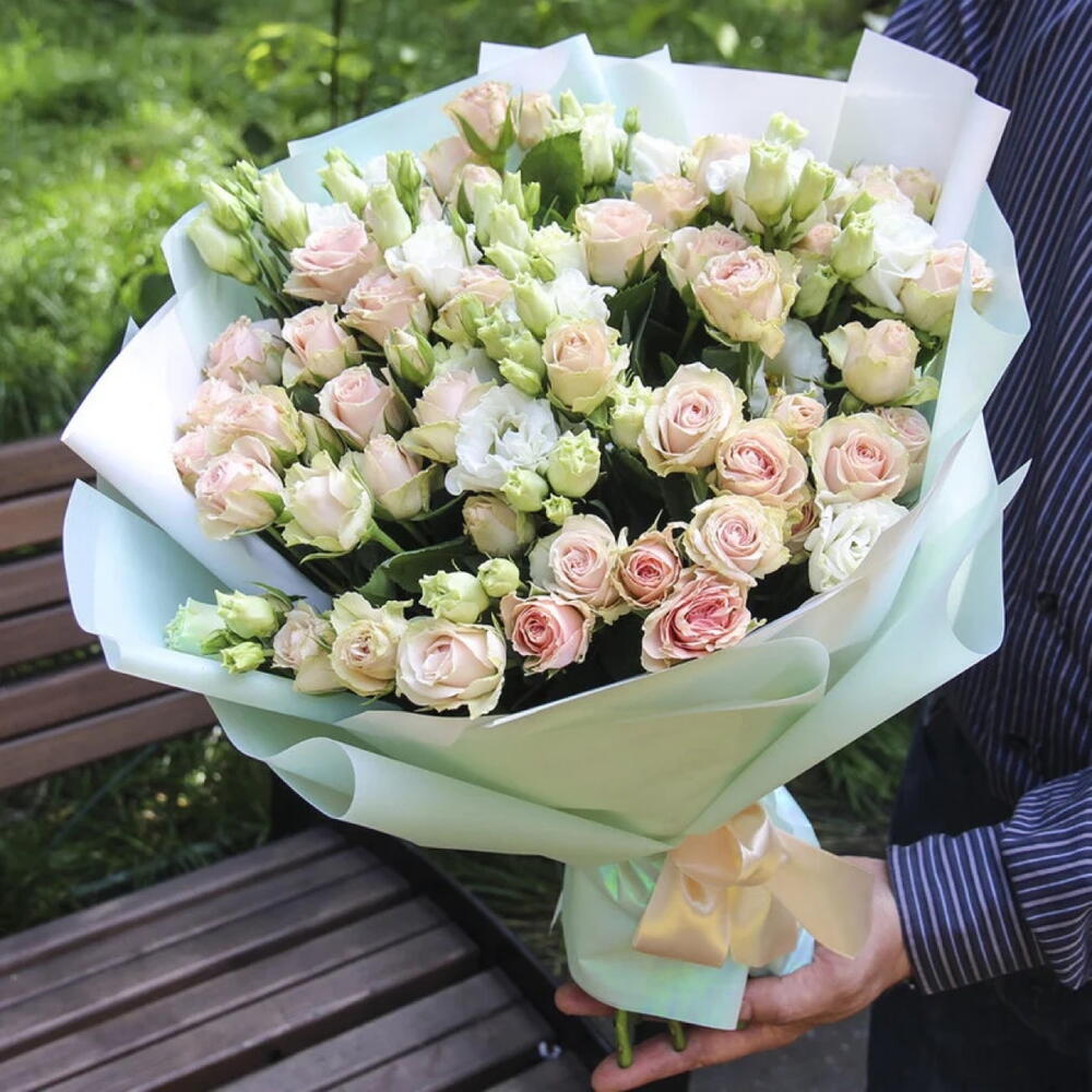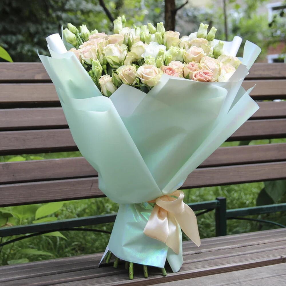 La cinta - 1 ud. Decoration - 1 ud. Eustoma white - 4 ud. tallo de rosa color rosa bebé - 15 ud.