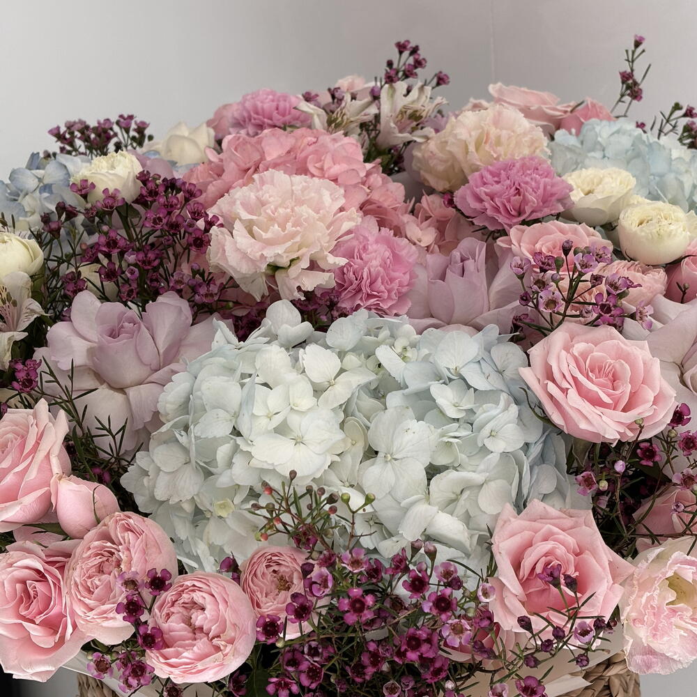 Eustoma - 5 ud. Spray rose - 20 ud. Hydrangea - 4 ud. Wax flower - 12 ud. rose - 20 ud. carnation - 5 ud. cesta - 1 ud. alstroemeria - 5 ud.