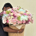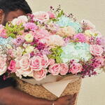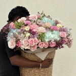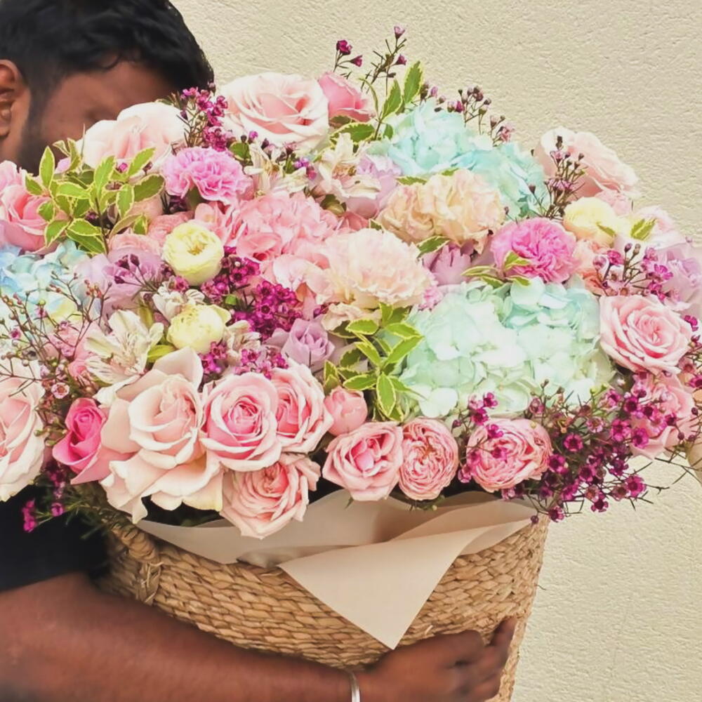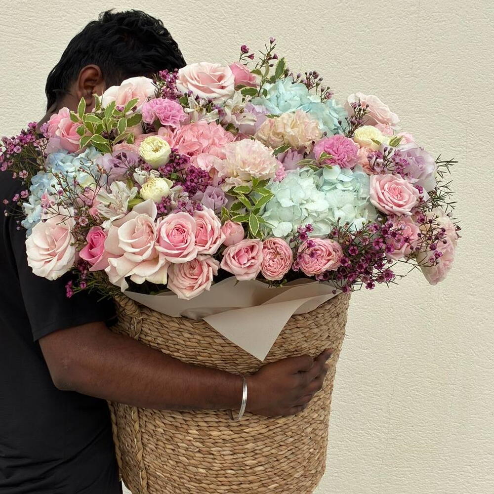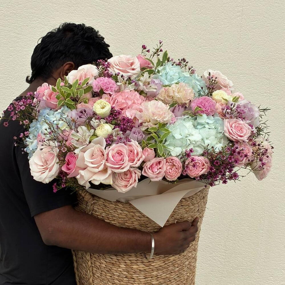 Una lujosa cesta gigante de flores con rosas e hortensias — la elección perfecta cuando quieres impresionar de verdad. Este gran arreglo floral está creado con flores frescas de primera calidad: rosas delicadas, hortensias etéreas, flores estilo peonía y follaje decorativo, formando una composición suave, voluminosa y elegante. Esta gran cesta de flores es ideal para: — cumpleaños — aniversarios — propuestas de matrimonio — sorpresas románticas — regalos de lujo sin palabras Cada arreglo está hecho a mano por floristas profesionales usando únicamente flores frescas y de alta calidad y se presenta en una elegante cesta tejida. Entrega de flores el mismo día en Dubái disponible. El ramo llega totalmente arreglado y listo para regalar.