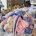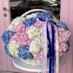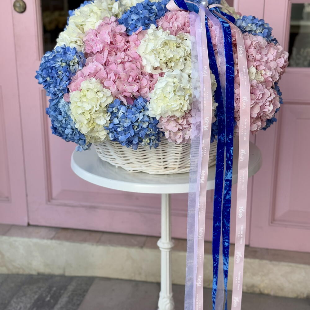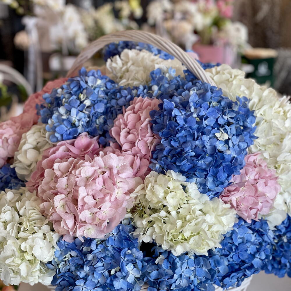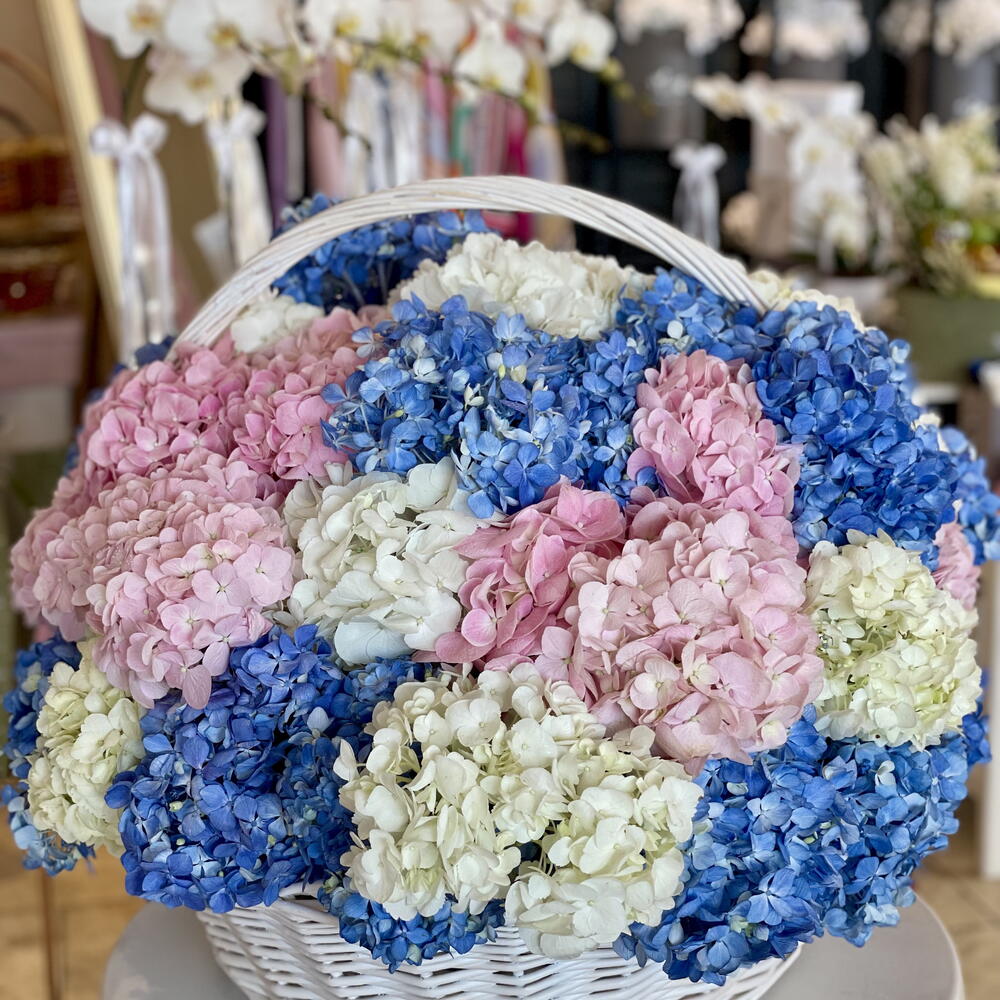 ¡71 impresionantes hortensias frescas en una mezcla de colores azul, rosa y blanco para encantar a cada corazón! ¡No hay nada más delicado y romántico que una cesta llena de hortensias! Haz que su corazón cante con este gesto supremo de aprecio y amor para esa persona especial. Tamaño de la cesta 75 x 55 cm.