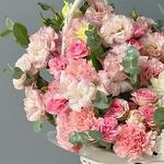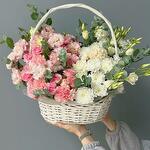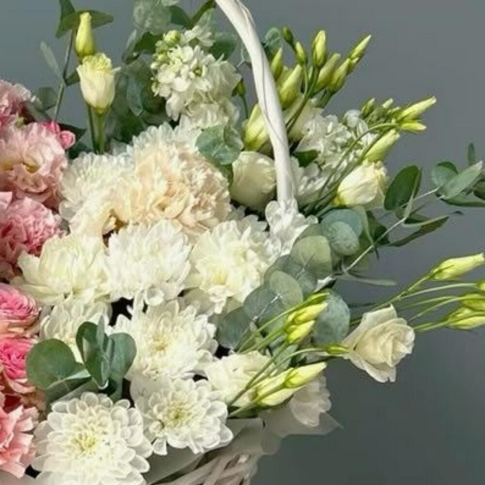 Este hermoso arreglo en cesta de mano presenta una combinación romántica y fresca de suaves *flores rosas y blancas*, creando una estética suave y elegante. El ramo incluye: - *Claveles rosas* y *rosas spray*, que simbolizan admiración y calidez - *Crisantemos blancos* y *lisianthus*, añadiendo pureza y sofisticación - *Alstroemeria* para un toque de encanto delicado - Acentuado con *follaje de eucalipto* para textura y un toque de frescura verde Perfecto para expresar afecto, celebrar momentos especiales o alegrar el día de alguien con belleza refinada y una paleta de colores suaves.