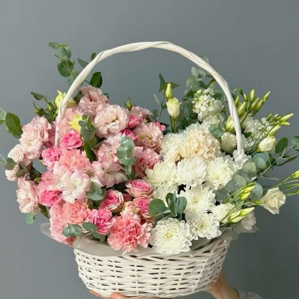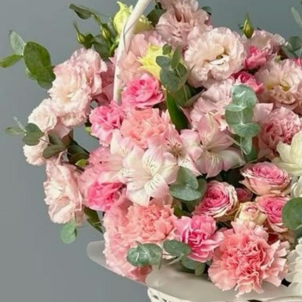 Alstroemeria - 10 ud. Basket - 1 ud. Lisianthus - 10 ud. claveles rosas - 10 ud. eucalyptus leaves - 8 ud. pink spray roses - 20 ud. crisantemo blanco - 15 ud.