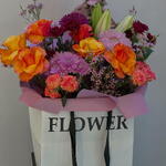 Un vibrante arreglo floral en bolsa que presenta rosas de un intenso naranja y amarillo, crisantemos de un burdeos profundo, suaves crisantemos color lavanda, claveles spray rosa, delicadas flores de cera y capullos frescos de lirio, todo bellamente envuelto en papel de seda lila y presentado en una elegante bolsa de regalo blanca. Perfecto para añadir color y alegría a cualquier ocasión.