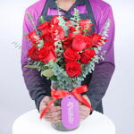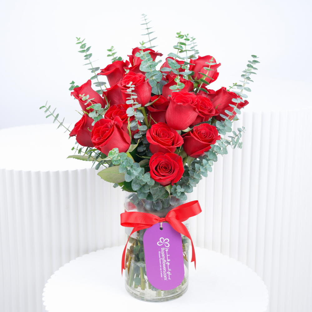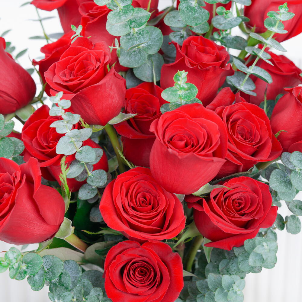 21 rosas rojas y 15 hojas de eucalipto, dispuestas en un jarrón alto de vidrio con una cinta roja y una etiqueta de la marca.