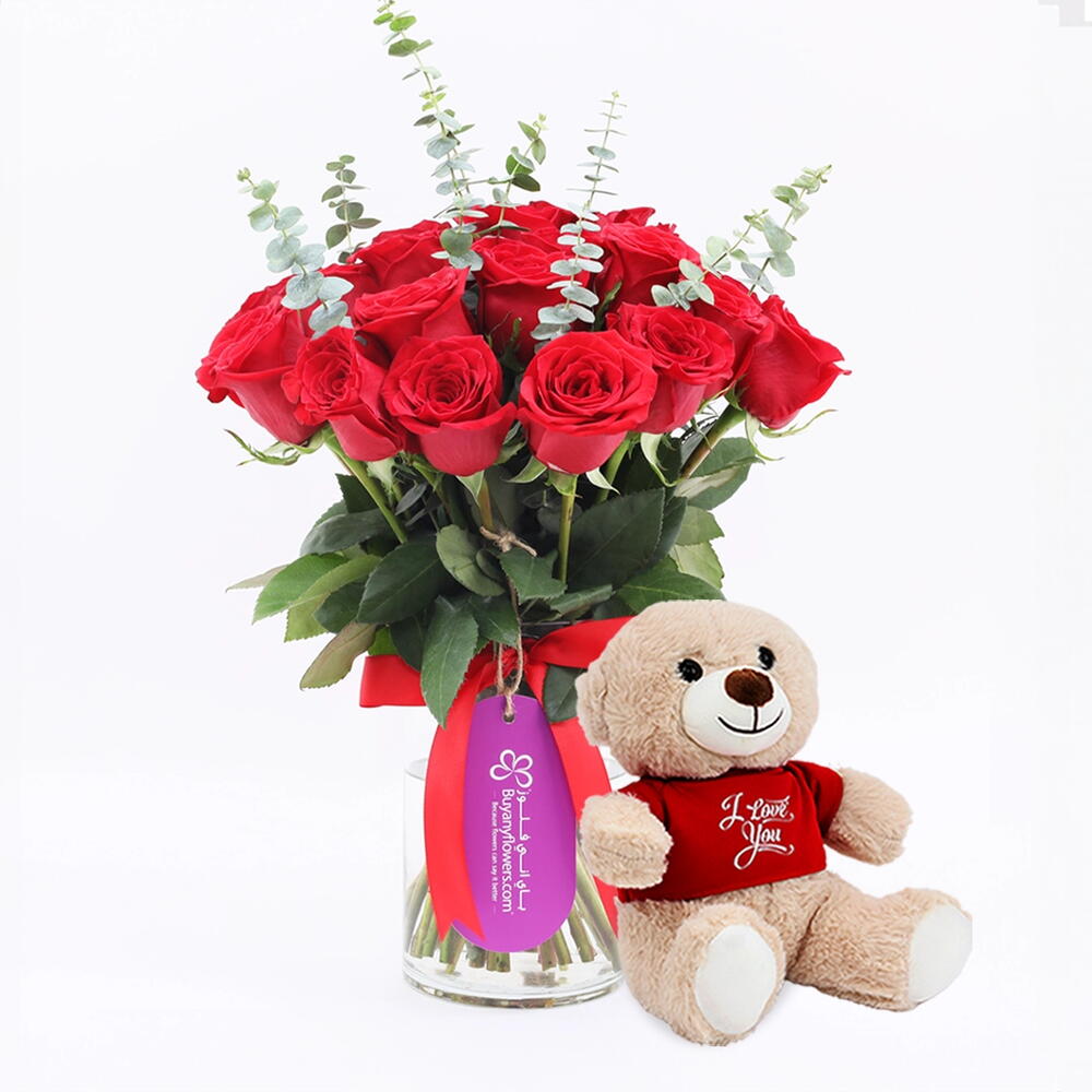 Beauty 21 Jarrón de Rosas Rojas y Osito de Peluche Te Amo