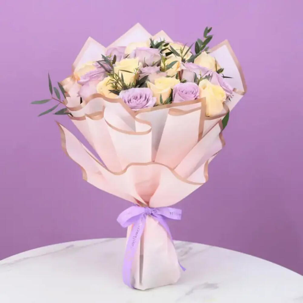 11 rosas moradas, 10 rosas durazno, hojas - 3 tallos Palviforia, envoltura con borde rosa y dorado, atado con moño de cinta morada.