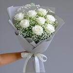 baby breath - 5 ud. cinta blanca - 1 ud. rosas blancas - 8 ud. envoltorio gris plateado - 2 ud.