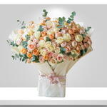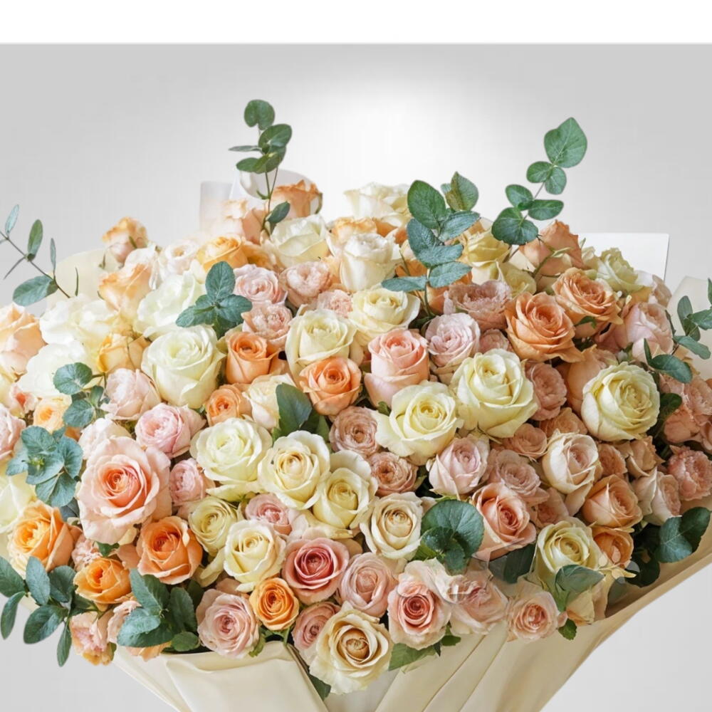 Peach Roses Symphony es un ramo de flores que presenta una armoniosa mezcla de rosas color durazno, rosa rubor y marfil cremoso. El arreglo está acentuado con follaje verde fresco, como eucalipto, y atado con una elegante cinta. Las rosas color durazno suelen elegirse para transmitir una sensación de sinceridad, gratitud y modestia. Se consideran una elección atemporal para ocasiones especiales como bodas, aniversarios y cumpleaños. Los colores pastel del ramo y su delicada apariencia están pensados para evocar sentimientos de calidez, ternura y encanto.