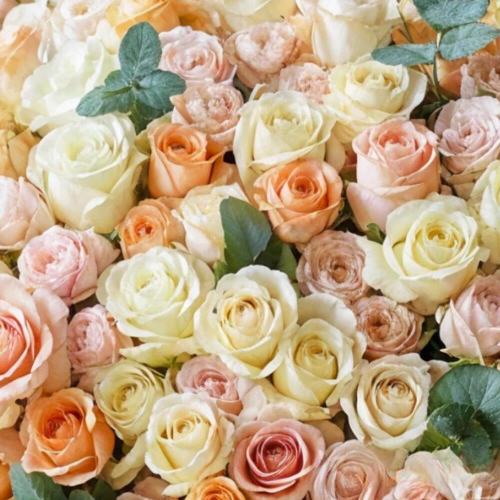 eucalyptus leaves - 10 ud. rosas melocotón - 11 ud. rosas rosa pastel - 51 ud. rosas blanco crema - 40 ud.