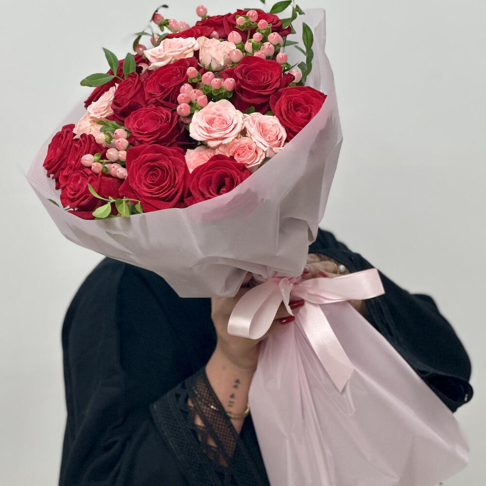 Este ramo redondo es una impresionante mezcla de rojos vibrantes y suaves tonos rosa. Las ricas rosas rojas se complementan con las delicadas rosas spray en el suave rosa Odilla, mientras que las bayas de hypericum rosa añaden un toque de textura y encanto. El follaje de Pistacia se entrelaza en el ramo, proporcionando un fondo frondoso y natural que realza la belleza de las flores. Envuelto en un suave rosa, el arreglo desprende una sensación cálida y romántica, lo que lo convierte en la elección perfecta para expresar amor y cariño en cualquier ocasión especial.
