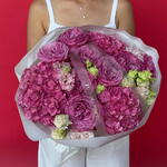 Berry Bloom — un ramo vibrante y expresivo creado para captar la atención y despertar emociones. Diseñado para quienes aman las flores audaces con un toque femenino, este llamativo arreglo presenta rosas de jardín magenta y rosa rubor, hortensias fucsia y suaves alhelíes verde lima para un toque de contraste y frescura.