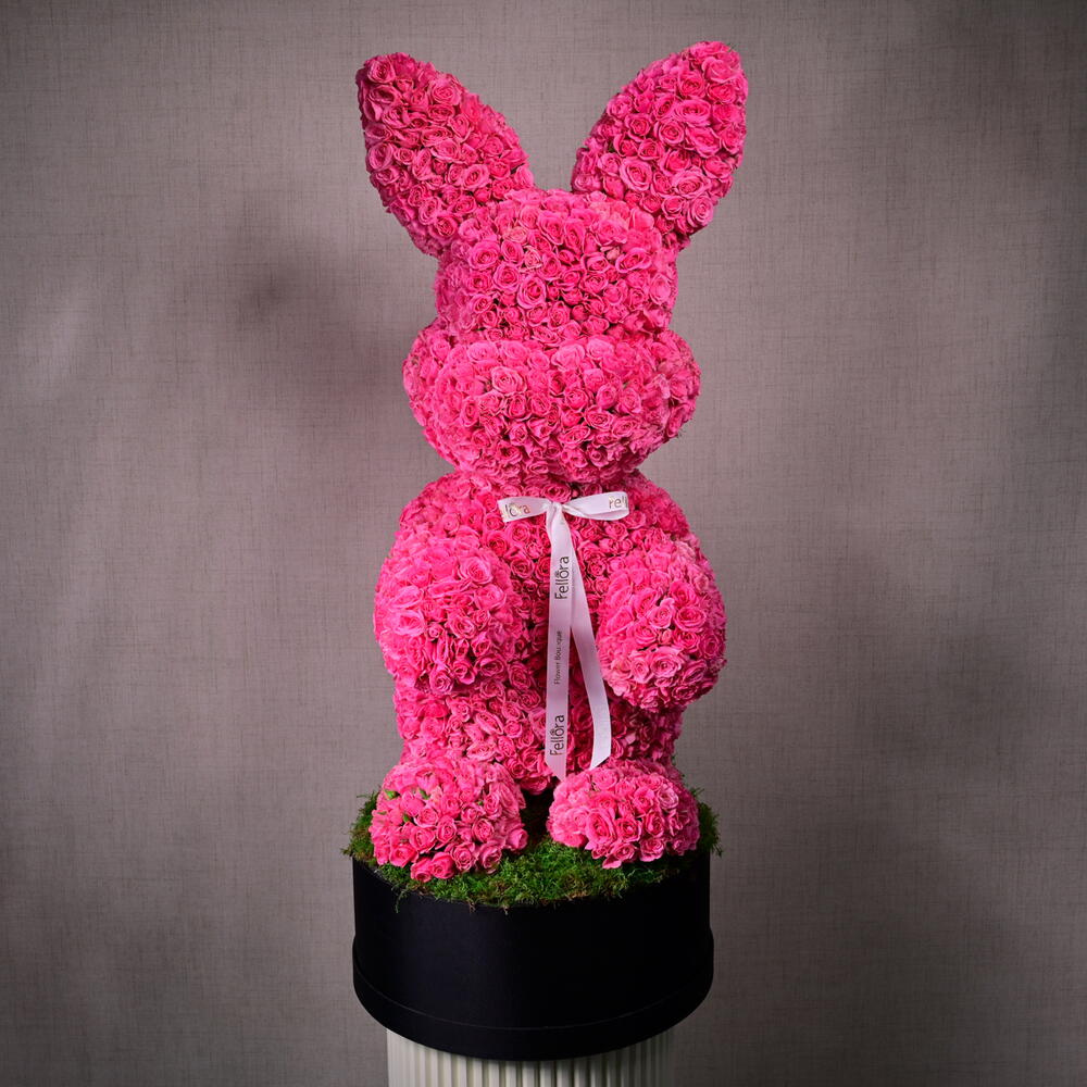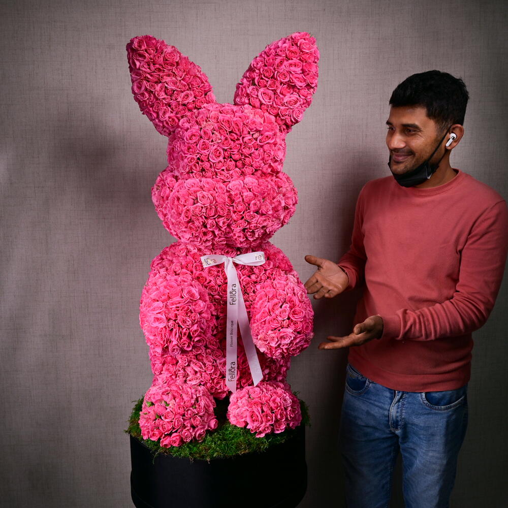 Presentamos nuestro encantador Big Pink Rabbit: una creación caprichosa hecha con 350 rosas spray, que mide 100 cm de alto y 50 cm de ancho. Ideal para eventos temáticos o como un regalo extraordinario. Disponible exclusivamente en Fellora Flower Boutique Dubai