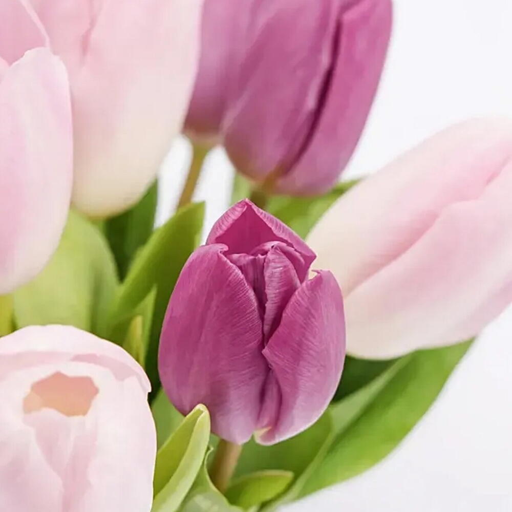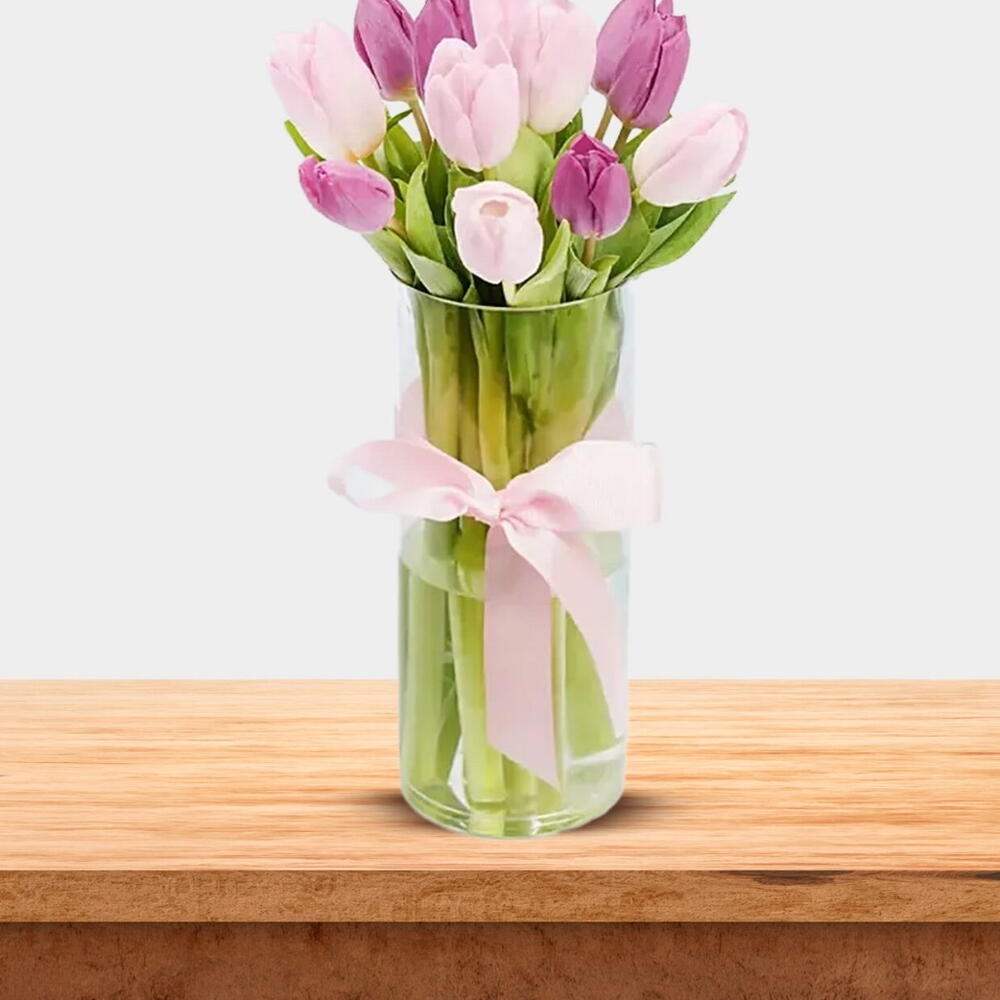 Seis tulipanes rosa rubor y algunos x tulipanes púrpura intenso dispuestos en un jarrón dorado craquelado. Irradiando cariño y sofisticación para momentos memorables.
