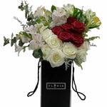 Red rose - 6 ud. Solidago - 4 ud. Green leaves - 2 ud. caja negra - 1 ud. limonio rosa - 2 ud. rosa7 blanca - 7 ud. steomeriya rosa - 2 ud. steomeriya blanca - 2 ud.