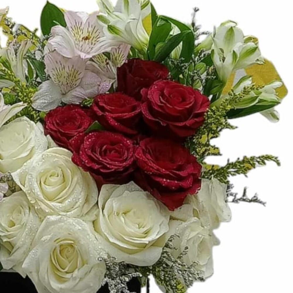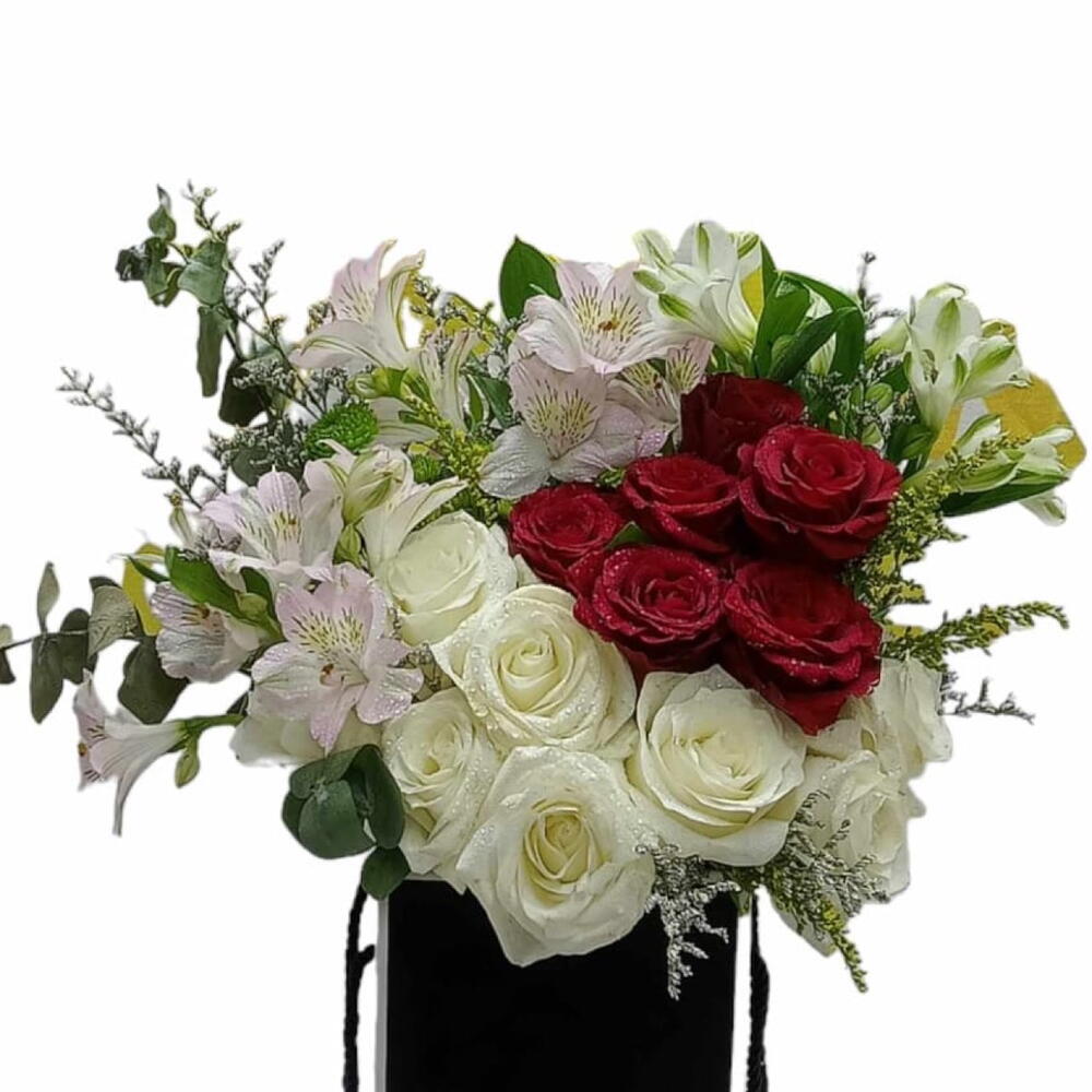Red rose - 6 ud. Solidago - 4 ud. Green leaves - 2 ud. caja negra - 1 ud. limonio rosa - 2 ud. rosa7 blanca - 7 ud. steomeriya rosa - 2 ud. steomeriya blanca - 2 ud.