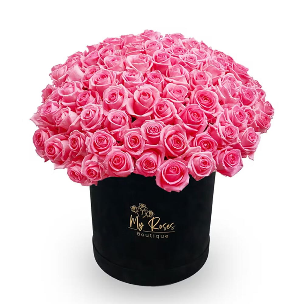 Caja de terciopelo negro con 100 rosas rosadas