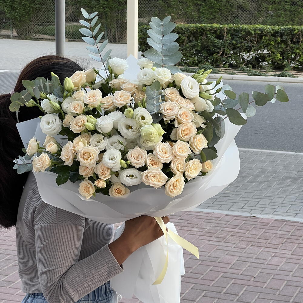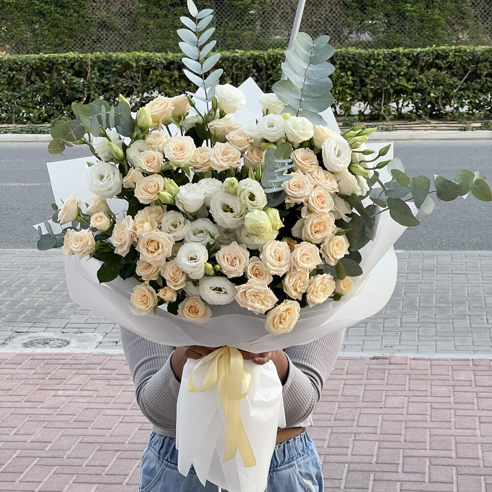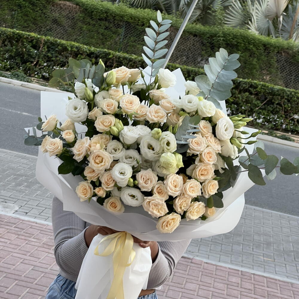 Eucalyptus - 4 ud. white lisianthus - 6 ud. rosas en spray color melocotón - 7 ud.
