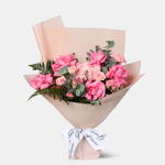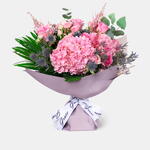 Greenery - 3 ud. Hydrangea - 1 ud. carnation - 1 ud. limonium purple - 1 ud. spray roses - 2 ud. pink roses - 5 ud.
