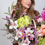 Cymbidium white - 1 ud. statice rosa - 5 ud. limonium purple - 3 ud. eustoma rosa claro - 2 ud. hortensia verde lima - 2 ud. gravilla leves - 3 ud. matthiola rosa oscuro - 7 ud. orquídea de otoño - 1 ud. crisantemo santini púrpura - 5 ud.