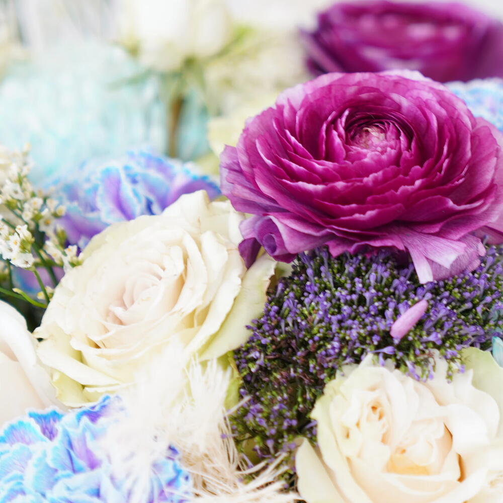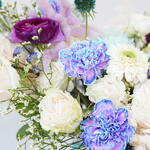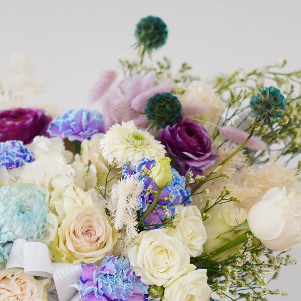 carnation - 8 ud. white hydrangea - 1 ud. flores moradas - 4 ud. rosas blancas - 15 ud. crisantemo - 2 ud.