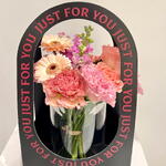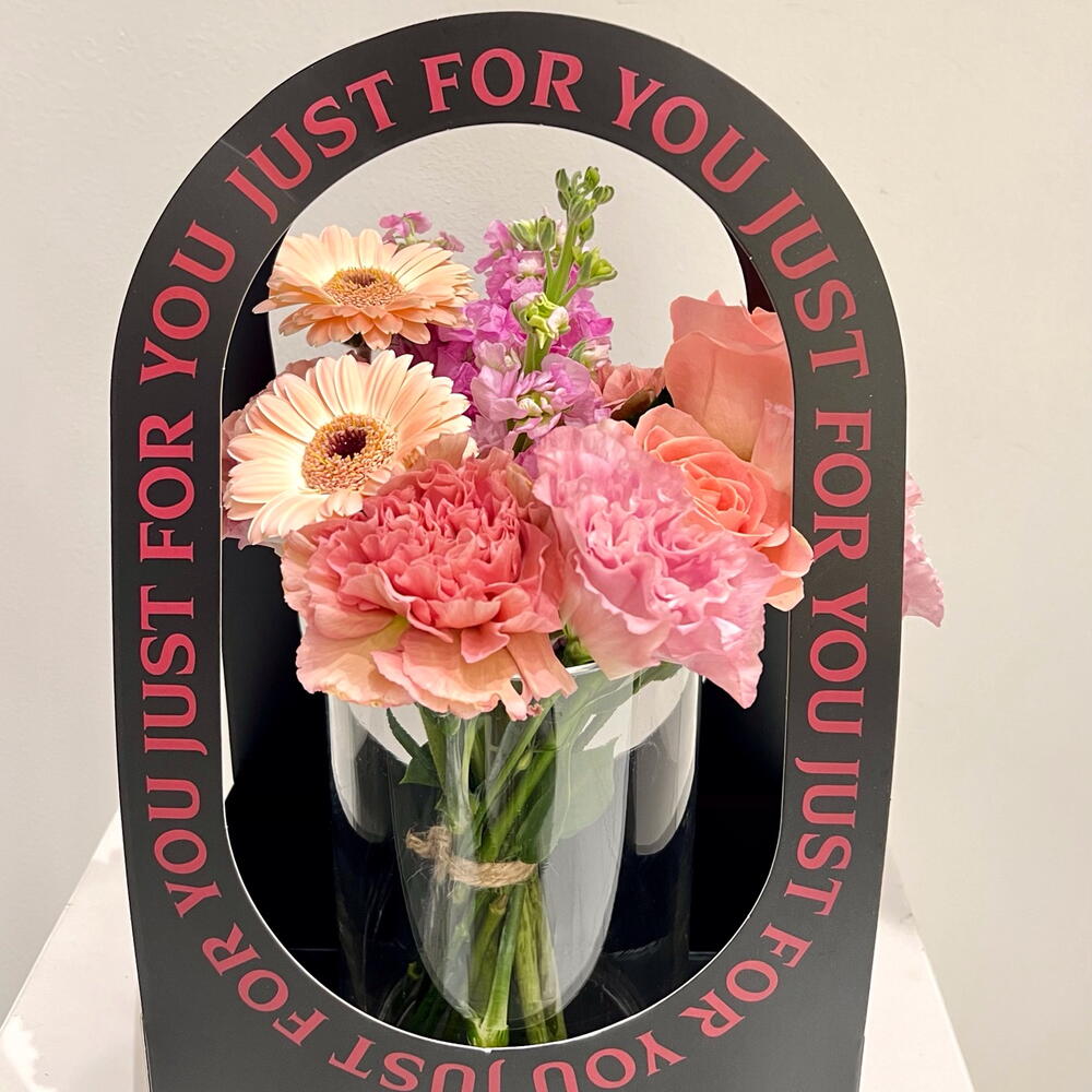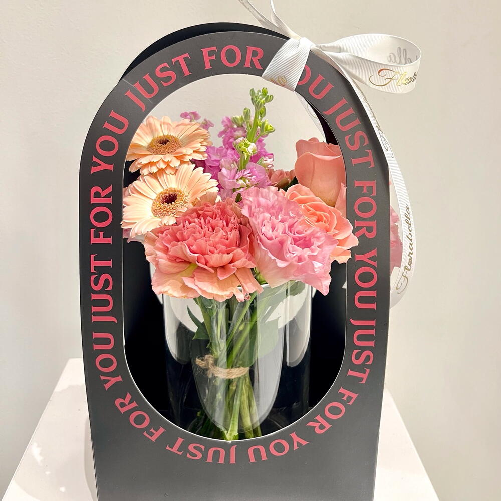 carnation pink - 3 ud. gerbera pink - 2 ud. matthiola pink - 3 ud. jarrón transparente - 1 ud. lisianthus rosa claro - 5 ud.