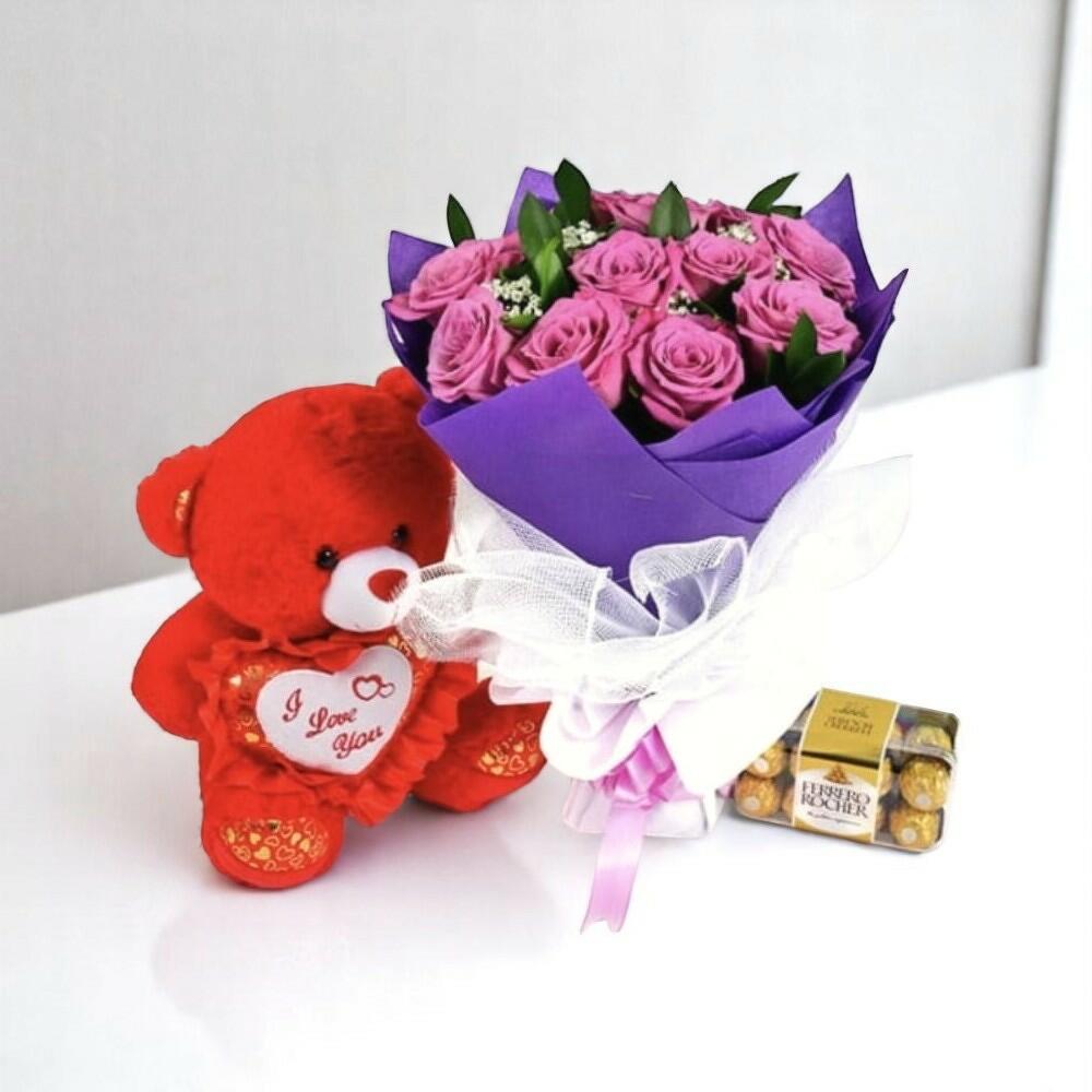 ¡Derrite el corazón de tu ser querido con este encantador y romántico set! Este set de regalo incluye un impresionante ramo de vibrantes rosas rosadas envueltas en elegantes tonos morado y blanco, acompañado de un tierno osito de peluche rojo con un corazón "Te amo", y un dulce detalle: una caja de bombones Ferrero Rocher. Es el detalle perfecto para San Valentín, aniversarios o declaraciones de amor espontáneas. Recorta los tallos de las rosas en diagonal antes de sumergirlas en agua fresca. Cambia el agua cada 1 o 2 días y mantén las flores alejadas del calor, la luz solar directa y las frutas en maduración. Guarda los bombones en un lugar fresco y seco.