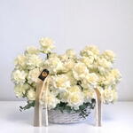Radiando elegancia y pureza, este lujoso ramo de rosas blanco crema hace una declaración de gracia para cualquier ocasión. Dispuesto bellamente en una cesta de mimbre blanca y rematado con cintas de la marca, evoca una sofisticación atemporal. Ya sea como regalo de boda, gesto de condolencia o expresión de amor puro, este arreglo floral habla directamente al corazón. Mantenga el ramo en un lugar fresco, alejado de la luz solar directa o de fuentes de calor. Rocíe ligeramente los pétalos con agua diariamente y añada agua a la base de espuma floral para prolongar la frescura y la vitalidad de las flores. Un regalo deslumbrante que nunca deja de impresionar.