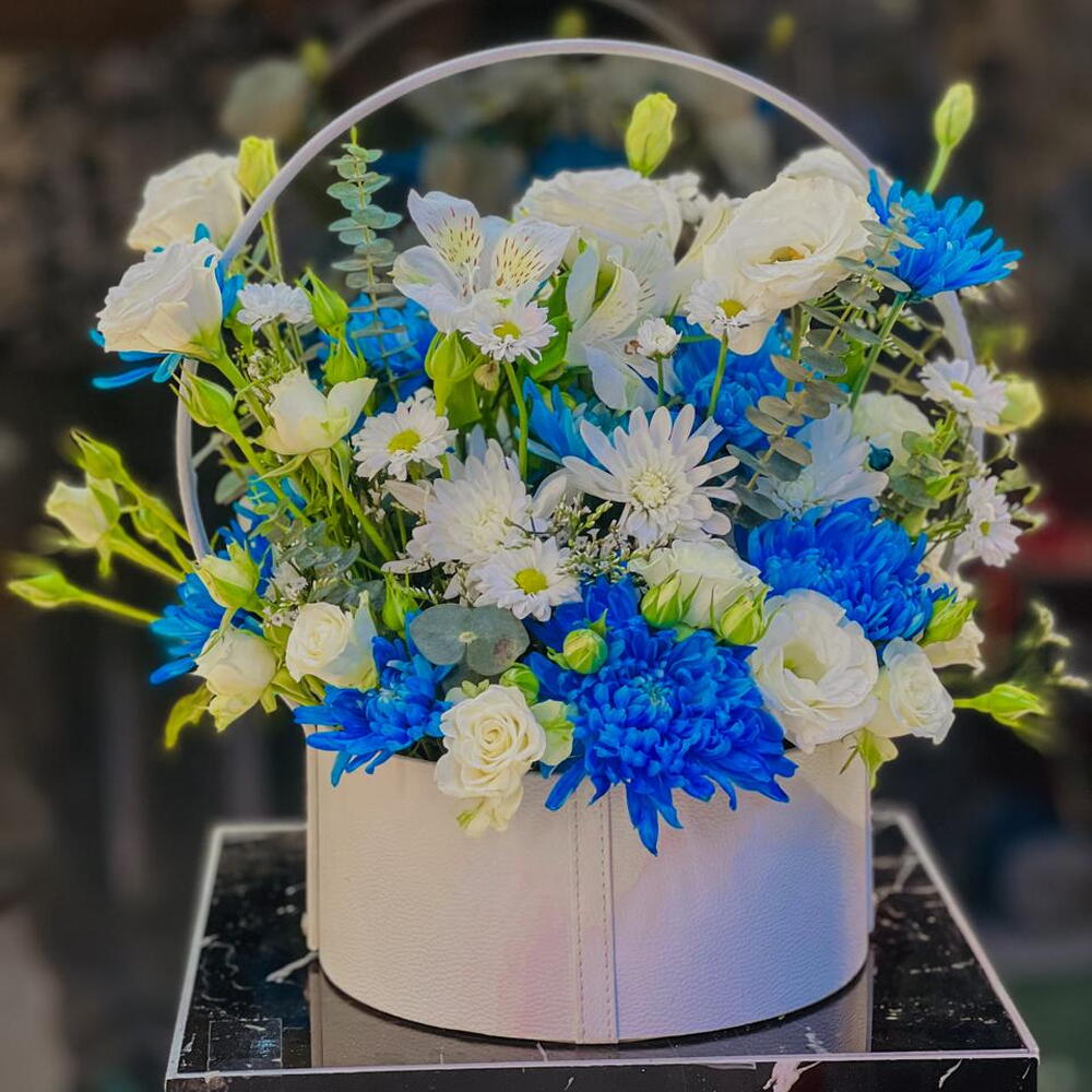 Este elegante arreglo floral rebosa frescura y contraste, combinando la serenidad del blanco con la audaz vivacidad del azul. Alojado en una caja redonda de cuero blanco con asa, el ramo incluye: Crisantemos azul real para un toque dramático de color Lisianthus blancos y rosas blancas, aportando suavidad y gracia Crisantemos blancos y pompones de margarita, añadiendo alegría y plenitud Alstroemeria (lirio peruano) para un toque de elegancia Toques de paniculata y eucalipto para realzar la textura y el aroma