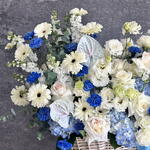 Eucalyptus - 20 ud. Gerbera - 10 ud. Anthurium - 2 ud. Lisianthus - 15 ud. matthiola - 10 ud. hydrangea blue - 10 ud. cesta grande - 1 ud. clavel azul - 20 ud. ohara rosas blancas - 25 ud.