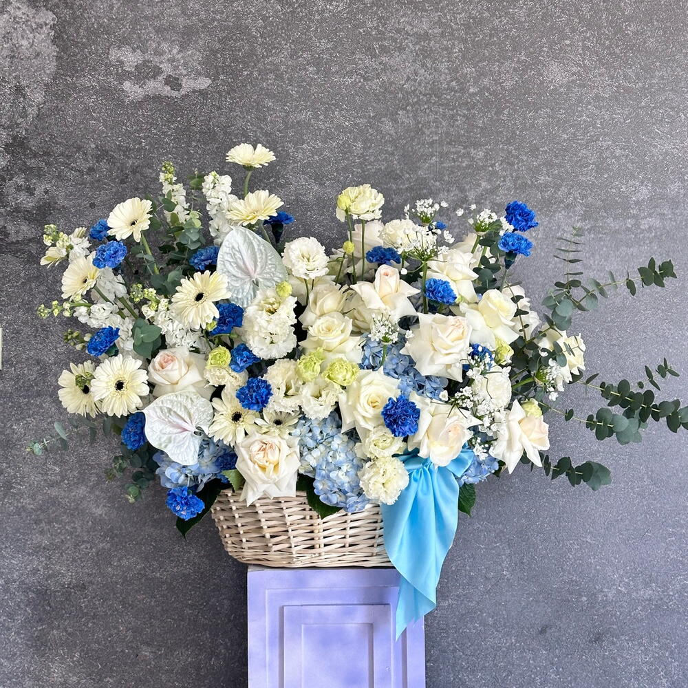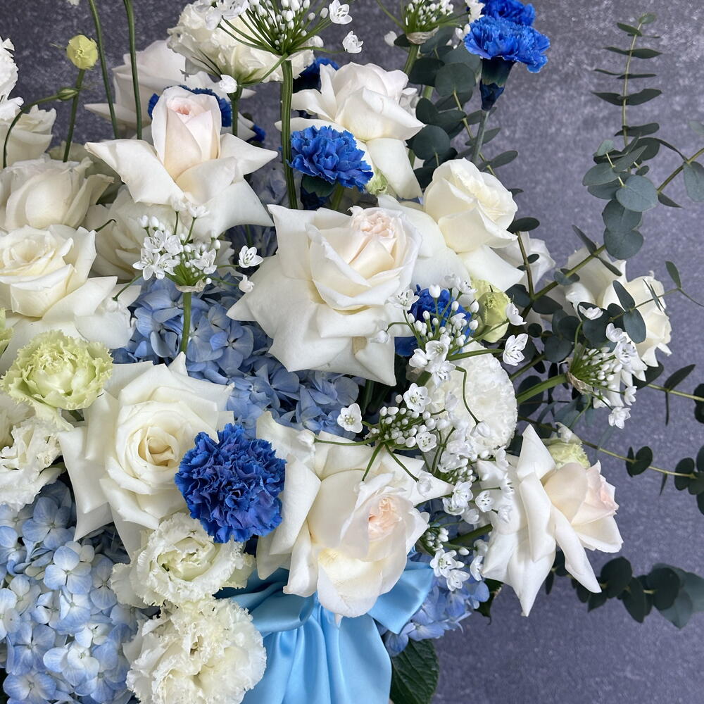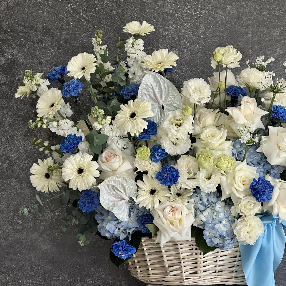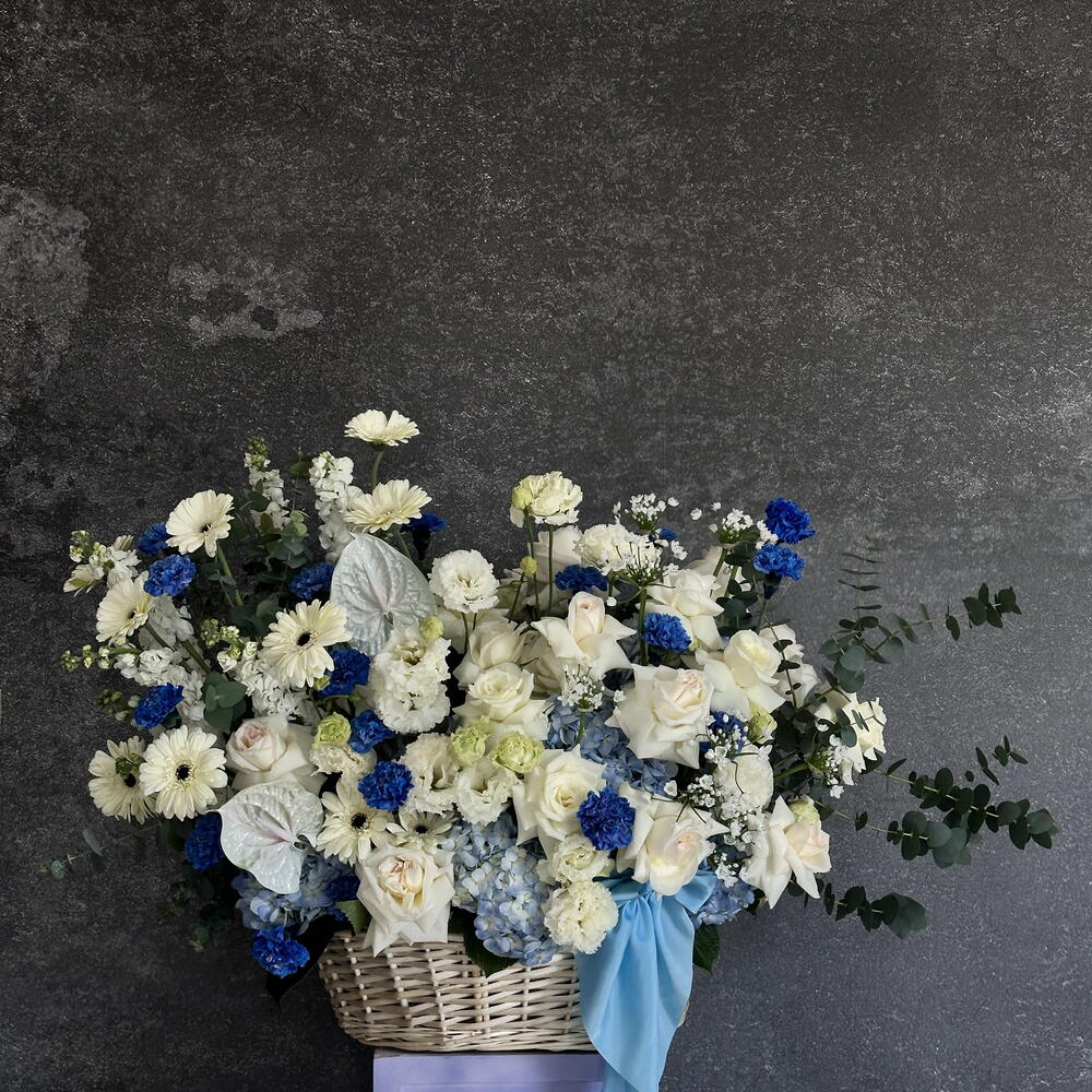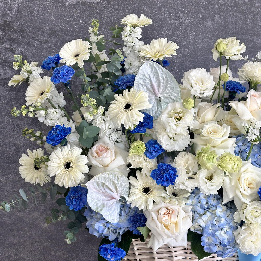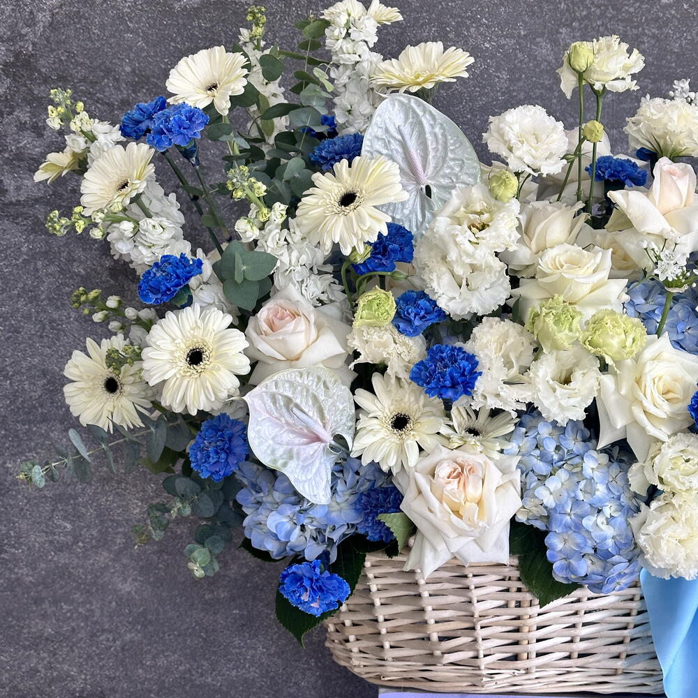 Eucalyptus - 20 ud. Gerbera - 10 ud. Anthurium - 2 ud. Lisianthus - 15 ud. matthiola - 10 ud. hydrangea blue - 10 ud. cesta grande - 1 ud. clavel azul - 20 ud. ohara rosas blancas - 25 ud.