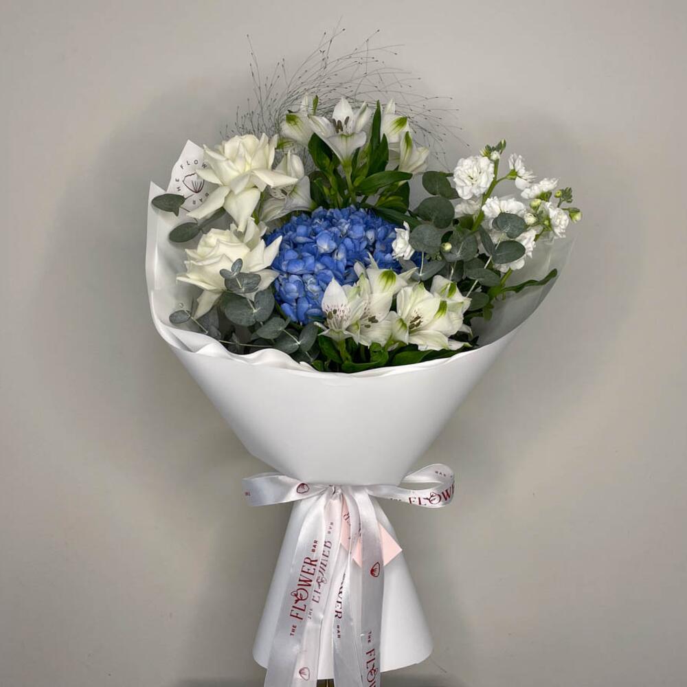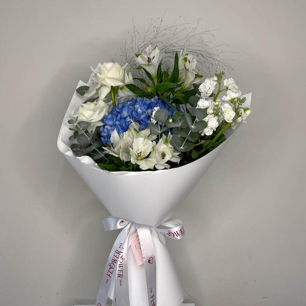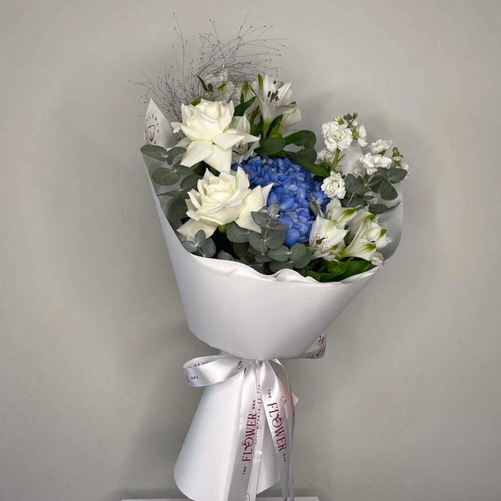Un bouquet blanco impecable que presenta la belleza atemporal de rosas blancas y alstroemerias, complementado por fragantes mattiolas blancas y realzado por delicadas flores de hortensia azul, todo envuelto en un elegante papel blanco.
