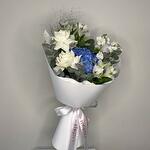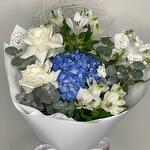 Eucalyptus - 1 ud. rose white - 2 ud. alstroemeria blanca - 2 ud. hydrangea blue - 1 ud. panicum - 2 ud. matthiola blanca - 1 ud. envoltura de ramo - 1 ud.
