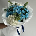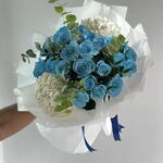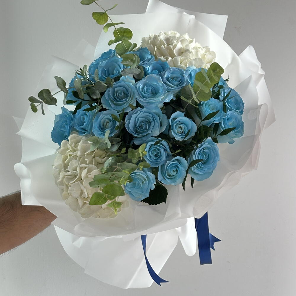 Make a bold and elegant statement with our Blue Elegance Hydrangea Rose Bouquet 💙✨ Featuring 20 beautifully crafted blue roses (white roses delicately spray-colored in blue) paired with 2 fresh white hydrangeas, this bouquet exudes charm and sophistication. Accented with fresh green fillers and wrapped in stylish blue and white wrapping paper, finished with matching blue ribbons, this arrangement is perfect for creating a lasting impression. Ideal for birthdays, anniversaries, congratulations, or special surprises, this bouquet adds a unique and luxurious touch to any occasion. ✨ Includes: • 20 Blue Roses (Spray-Colored White Roses) • 2 White Hydrangeas • Fresh Green Fillers • Premium Blue White Wrapping with Blue Ribbon 🌸 Elegant, vibrant, and eye-catching design 🎨 Shade of blue may slightly vary due to spray coloring 💝 A perfect choice to express love, admiration, and celebration in a unique way!