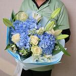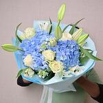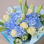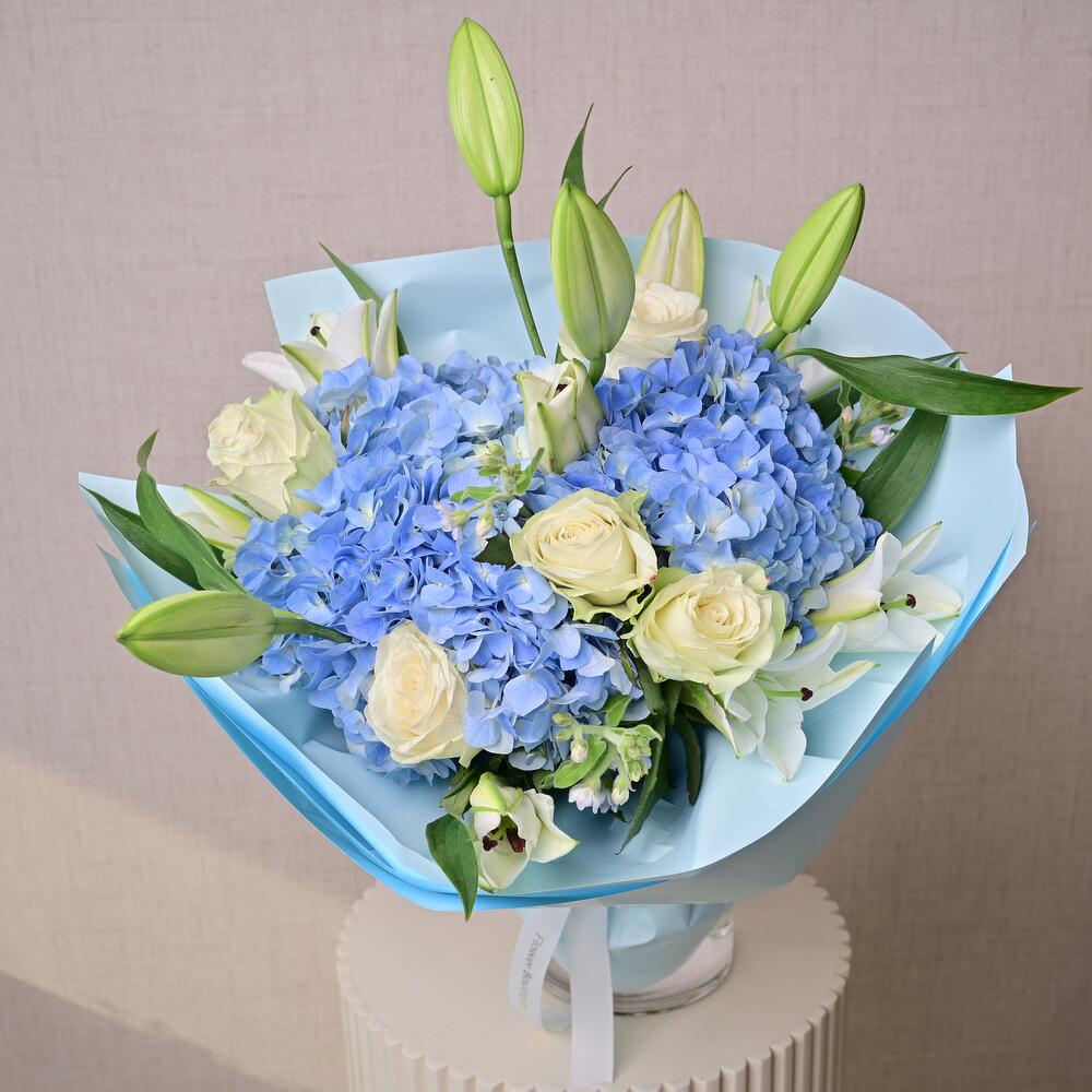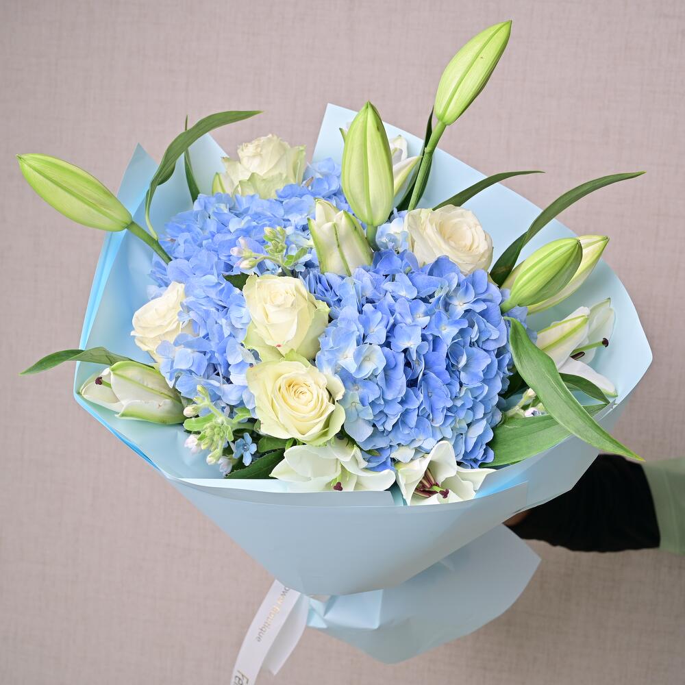 Ramo con hortensia azul, lirios blancos, rosas blancas y oxypetalum. Perfecto para cumpleaños, regalos corporativos y ocasiones premium.