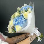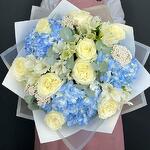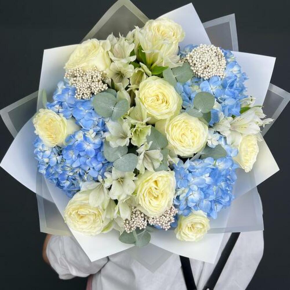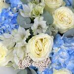 Déjate llevar por la serena belleza de nuestro Ramo Serenidad Azul, un impresionante arreglo que combina la elegancia de las rosas blancas cremosas, el delicado encanto de las alstroemerias blancas, el frescor del eucalipto y los vibrantes tonos azules de las hortensias. Este ramo es una armoniosa sinfonía de colores y texturas, que irradia una sensación de tranquilidad y gracia. Las exuberantes rosas blancas simbolizan pureza y belleza atemporal, mientras que las hortensias azules aportan un toque de serenidad y paz. Las alstroemerias blancas añaden un matiz de sofisticación, y las hojas de eucalipto proporcionan un acabado refrescante y aromático. Meticulosamente arreglado y envuelto en un elegante embalaje blanco, es un regalo que habla con elocuencia de elegancia y consideración.