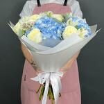 Satin ribbon - 1 ud. Eucalyptus - 5 ud. Hydrangea - 3 ud. Alstroemeria - 5 ud. design packaging - 6 ud. rosa peonía de una sola cabeza - 9 ud. ozothamnus seco - 3 ud.